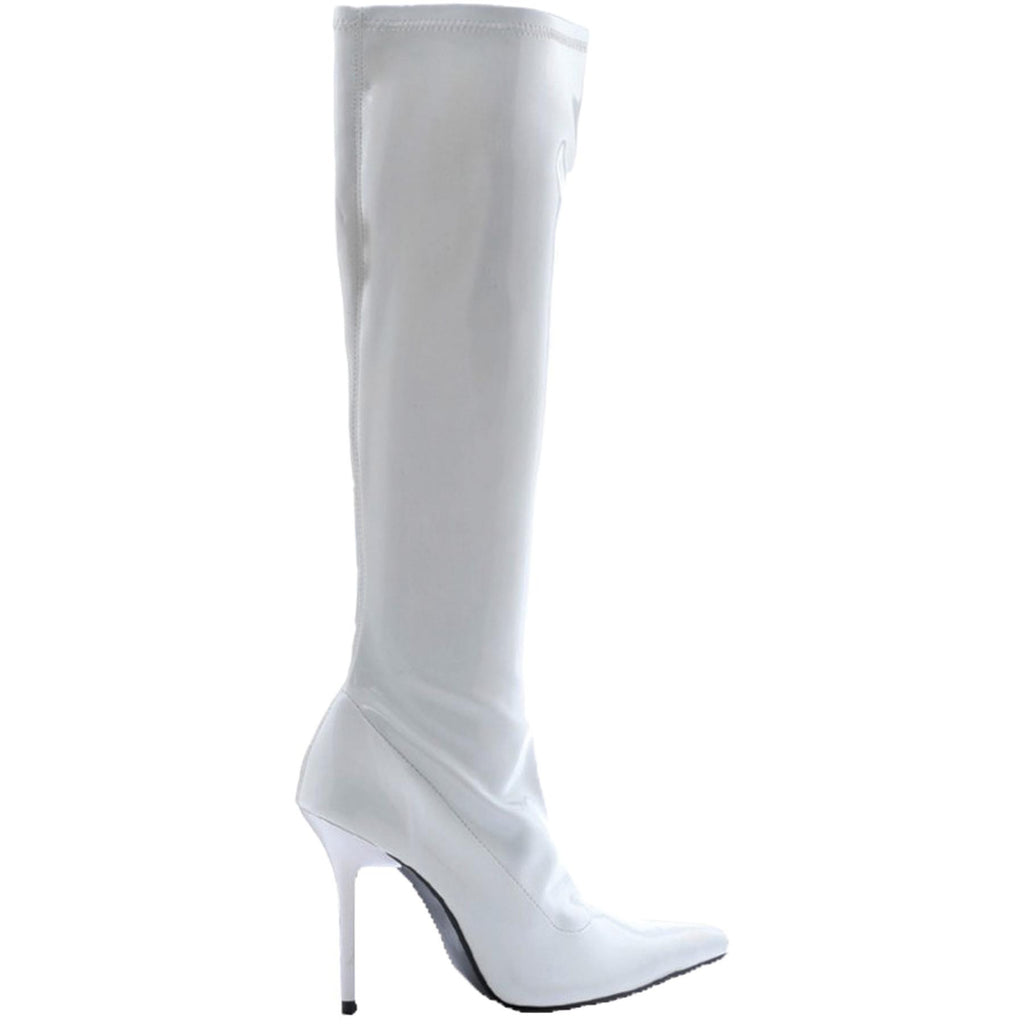Pull on patent boot with 4 inch stiletto heel and pointed toe. White. Size 11. No zipper, a pull-on boot.