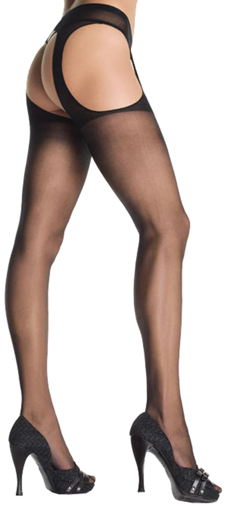 Sheer stockings with suspenders made into waistband. One size fits most women sized 6-12.