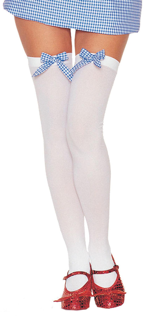 Quality opaque white thigh highs with blue/white gingham bow attached. One size fits most