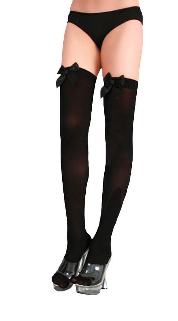 Black thigh high stockings with black bows. One size fits most adults. Opaque nylon.
