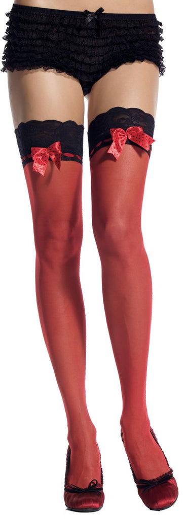 Lycra sheer thigh high with constrast lace top, bow, and woven trim. One size fits most adults.