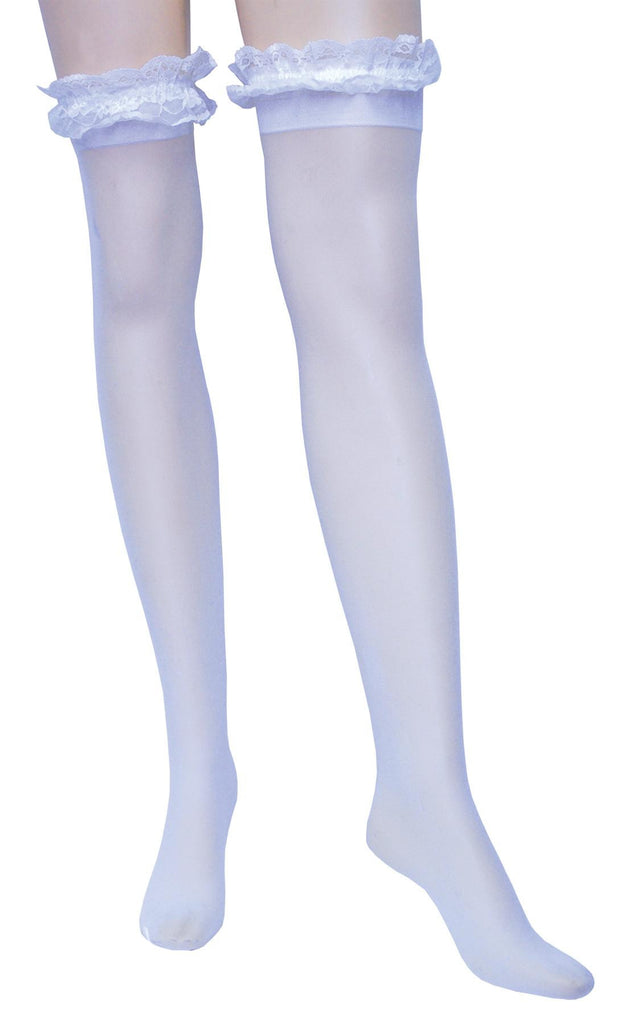 Sheer thigh high with garter lace ruffle top. One size fits most. White.