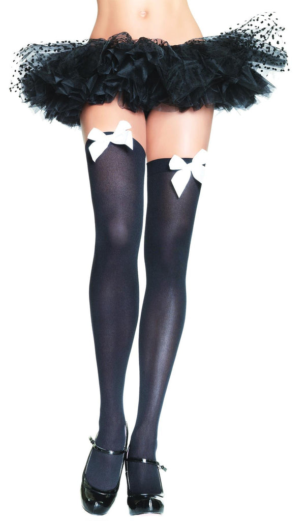 Red thigh highs with red satin bow. One size fits most adults. Opaque nylon.