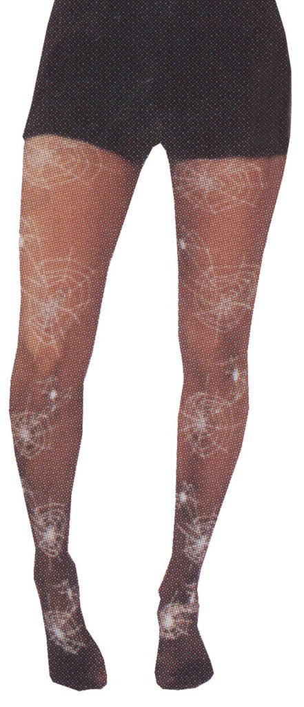 Black tights with white glow in the dark spider webs all over. One size