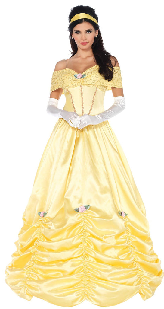 Once you wear this beautiful classic Beauty costume you should have no problem attracting all sorts of handsome beasts! Long off-the-shoulder yellow satin gown with ruched rosette trimmed skirt, attached clear straps, and matching satin hair ribbon. Gloves not included. Fits womens adult small sizes 4-6.