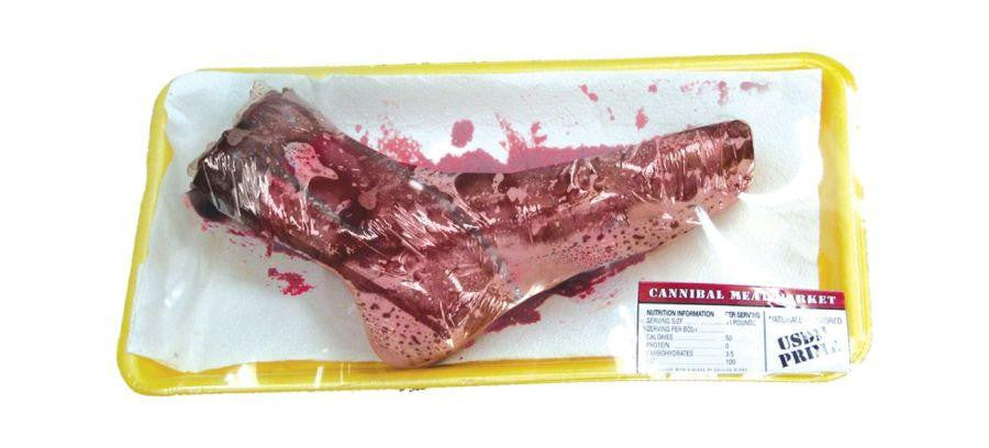 Gory human body parts wrapped exactly like normal beef. All latex body parts, offered on a styrofoam tray wrapped in cellophane. Includes a rope hanging hook wrapped with hand. Tray measures approx 9" x 4". Foot is approx. 8 1/2 " x 4 x 2".