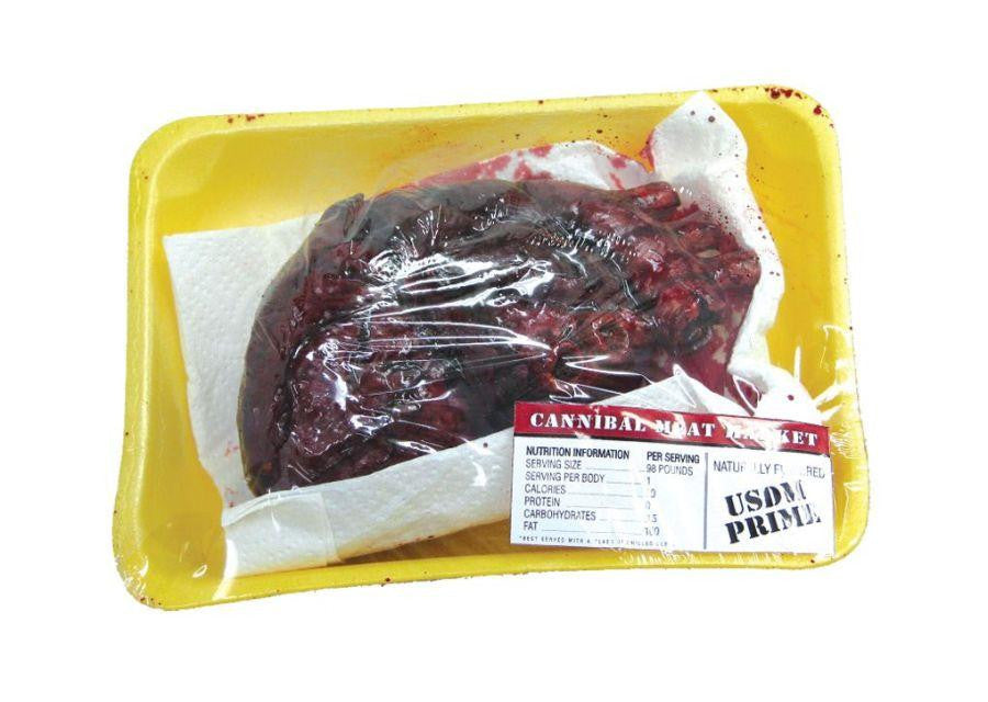 Gory human body parts wrapped exactly like normal beef. All latex body parts, offered on a styrofoam tray wrapped in cellophane. Tray measures approx. 8" x 5 1/2". Heart is approx. 6" x 4 1/2" X 2 1/2".