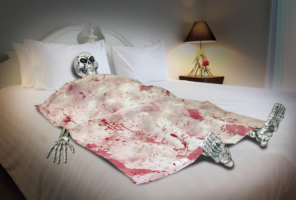 Great concept for haunted house scene. Head, hands, feet, and blood spattered sheet. Skeleton.