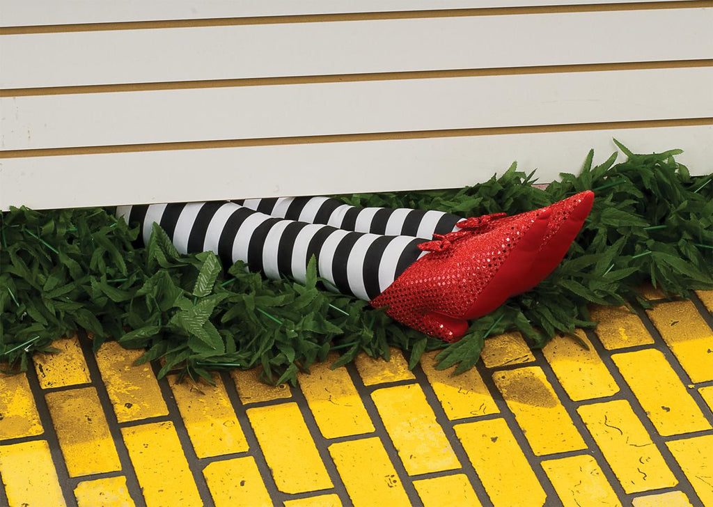 Just like the Wicked Witch legs sticking out from Dorothy's house. Black and white striped legs with look alike sequin cloth ruby slippers. The witch legs are made out of cloth and foam. Polyester. 18 inches.