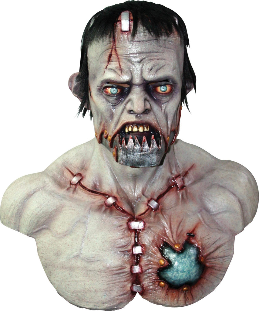 Full over-the-head latex mask with shoulders and chest piece. Lower jaw looks metallic and sutures look quite realistic.