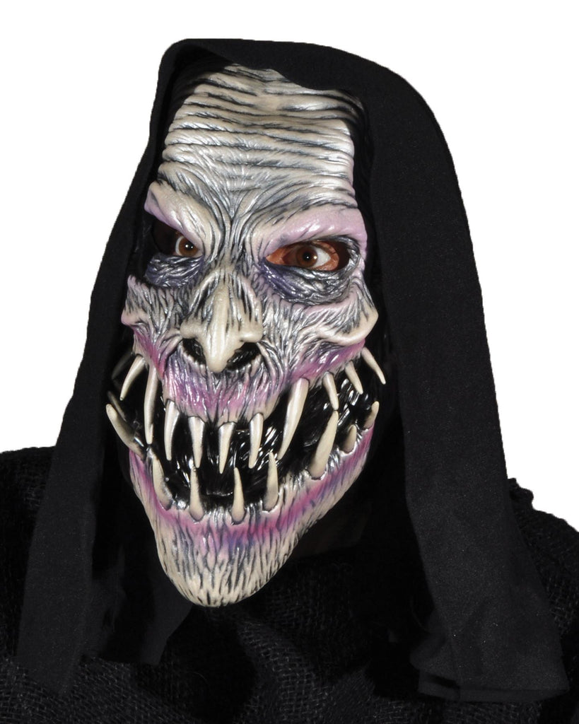 Fanged ghoul latex face mask attached to quality hood with elastic strapping.