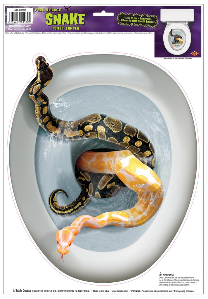 A great new gag idea perfect for your Halloween party. Place this topper on top of your toilet lid and keep everyone out of your bathroom! Features two slimy snakes slithering over the top of the lid! Horrifying! Vinyl. 12in x 17in sheet.