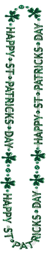 Sporting your favorite Irish holiday never looked so good! Cheer your friends on this season in our St. Patrick's Day Beads! Green 36in. necklace with "Happy St. Patricks Day" logo and shamrock leafs! Plastic. Just the accessory you need for St. Patrick's, parties, parades, and other fun productions and festivities!