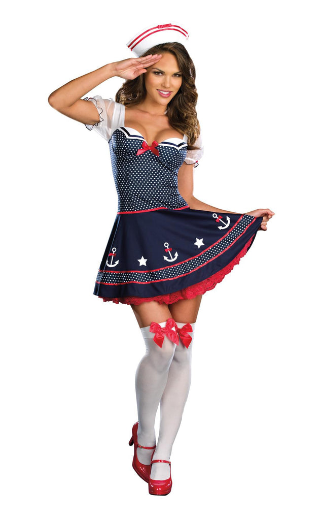 Stretch knit dress with sweetheart neckline has chiffon sleeves, polka dot bodice and a dropped waistline. Anchors on skirt are trimmed with real red bows. Includes hat with bow. Thigh highs and petticoat not included. 2 piece set. Adult extra large 14-16.